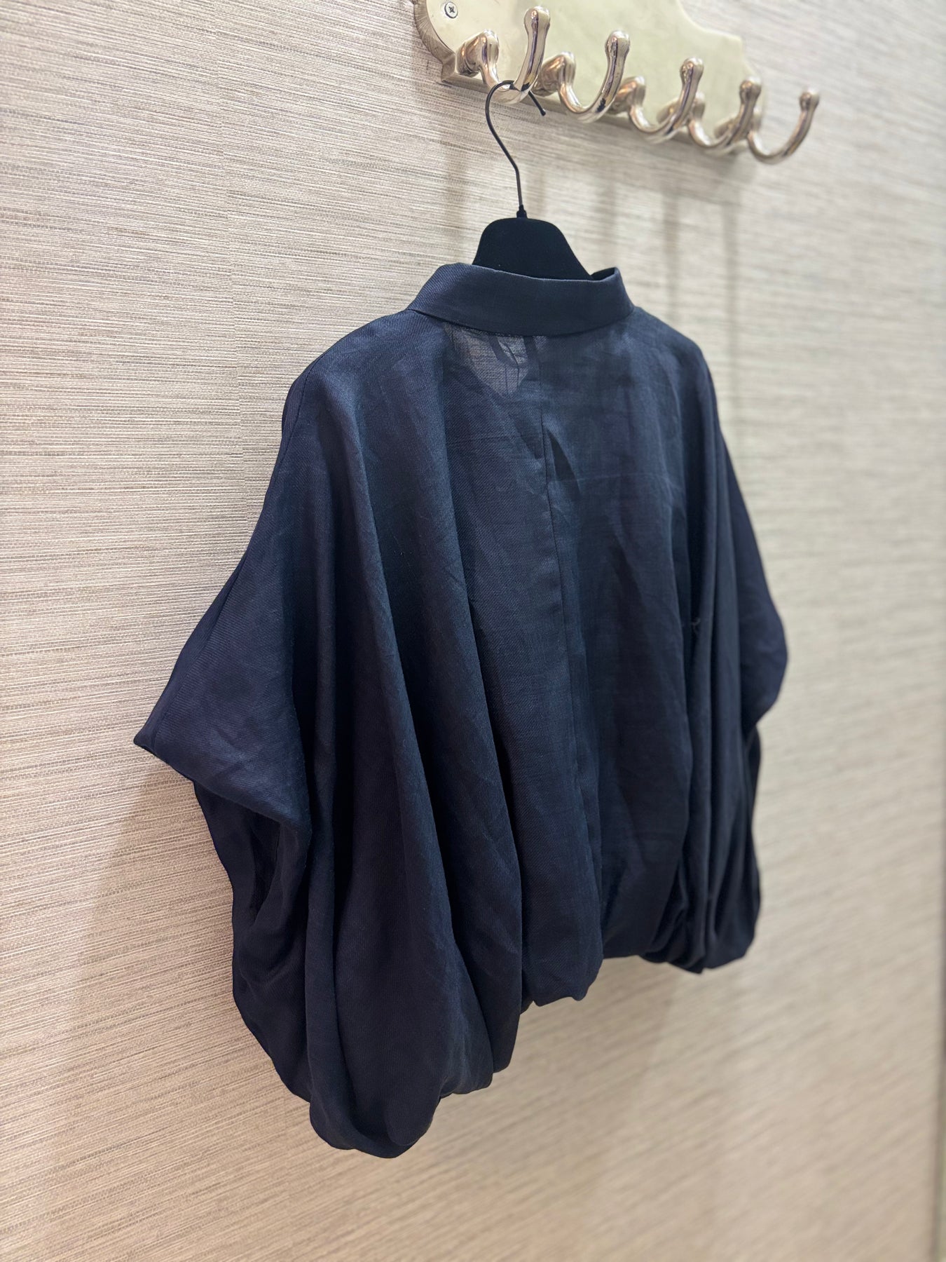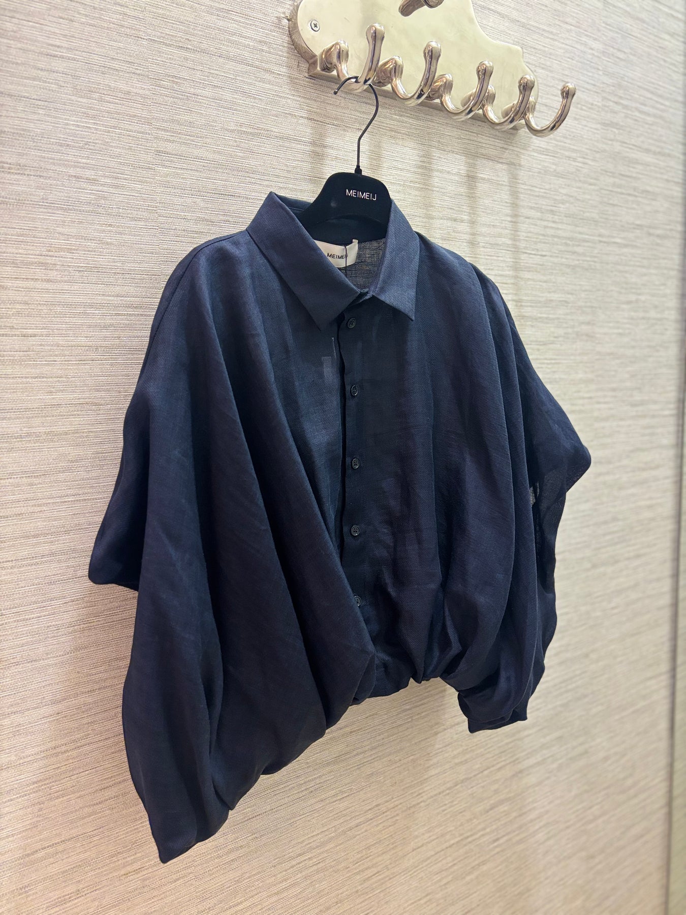 Regular price €265.00 Save 0%Meimeij Navy Fine Cotton Puff Gathered Elasticated Hem Crop Shirt.