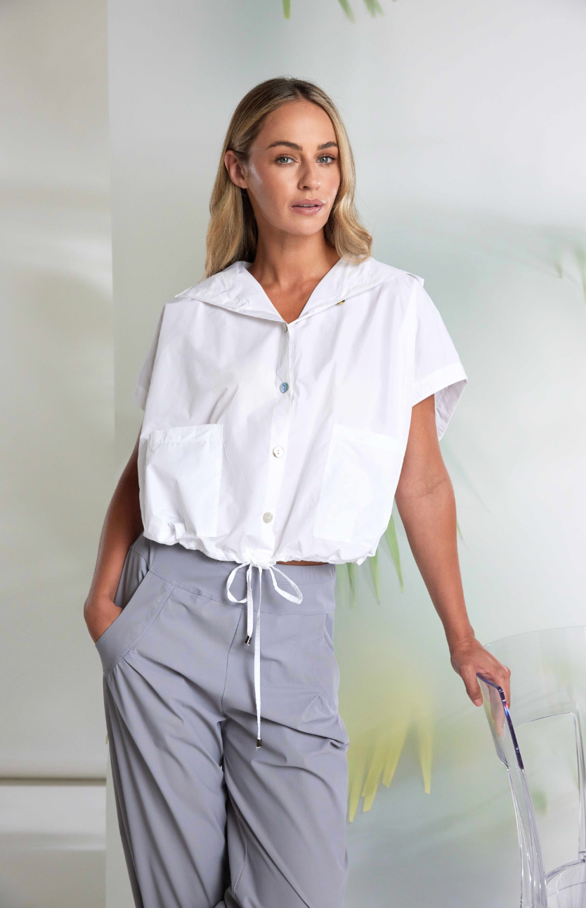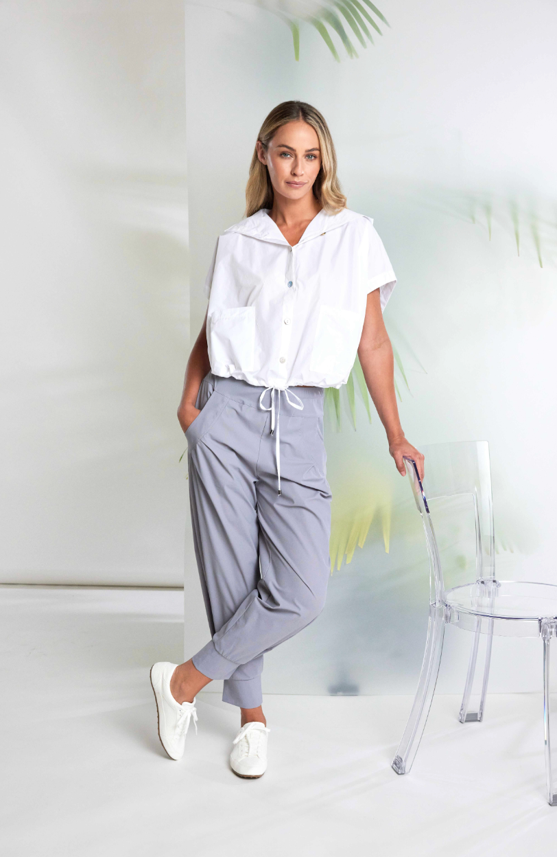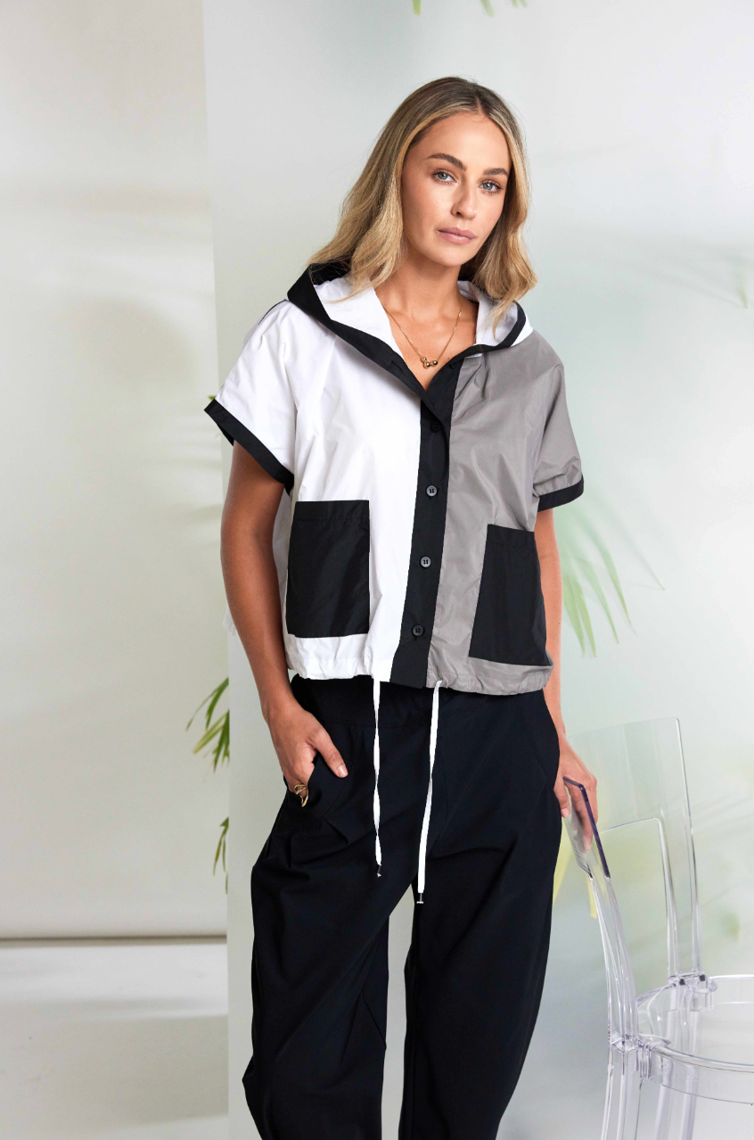 Regular price €139.00 Save 0%Naya Grey/White Lightweight Taffeta Boxy Sleeveless Hooded Jacket With Contrasting Black Patch Pocket Trim Detail.