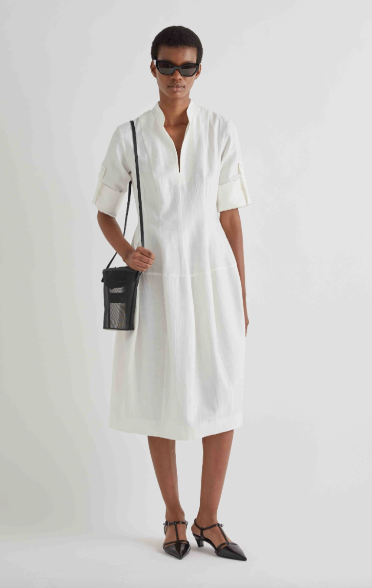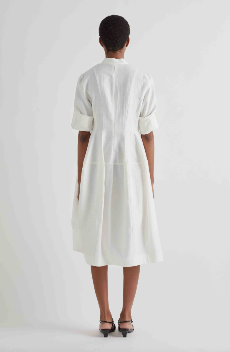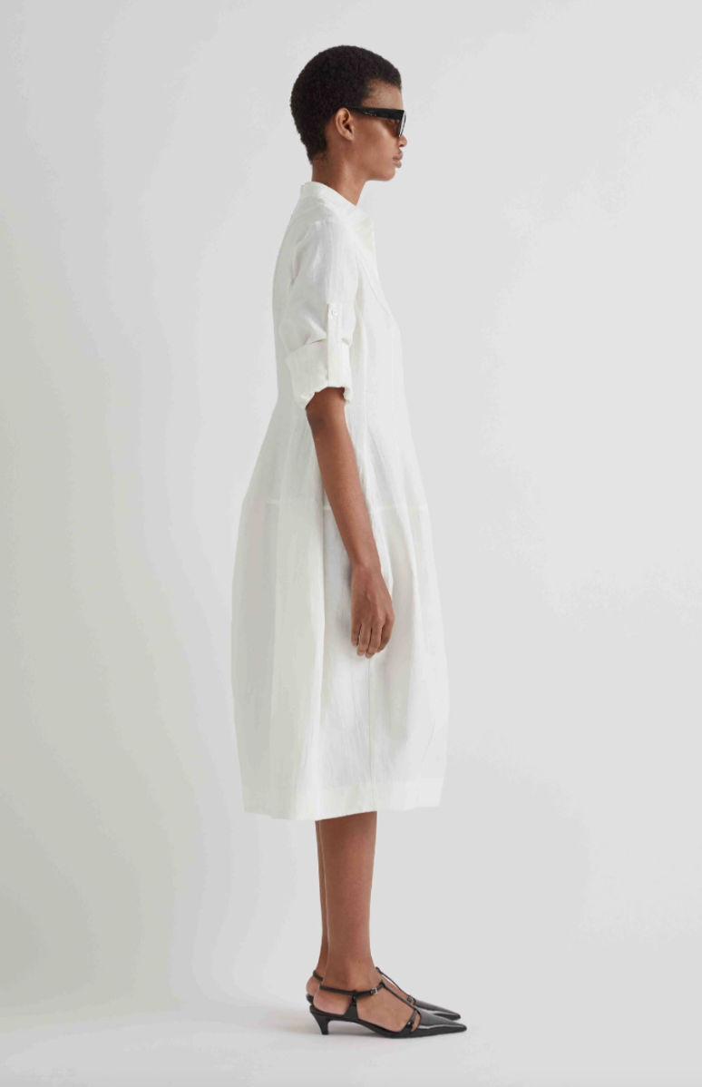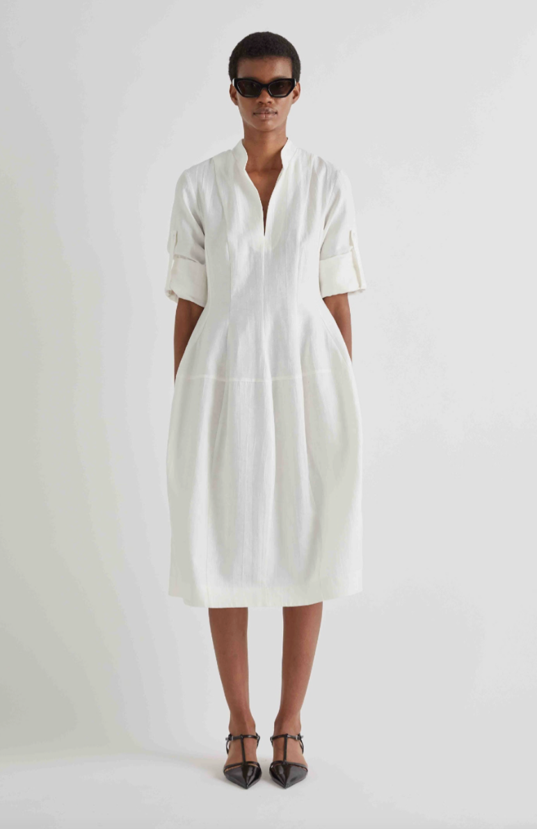 Regular price €340.00 Save 0%Meimeij Off White Linen/Cotton Blend Tapered End Midi Long Sleeve Dress.