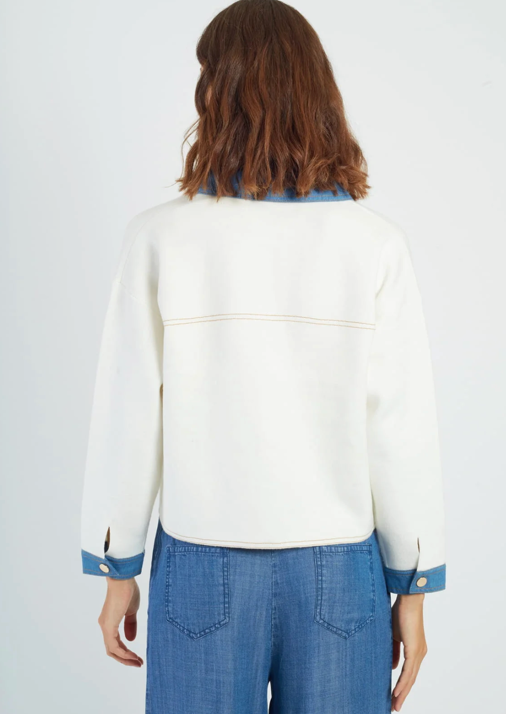 Regular price €105.00 Save 0%Derhy White Soft Cotton Blend Knit Over Shirt With Contrasting Denim Collar/Cuff.