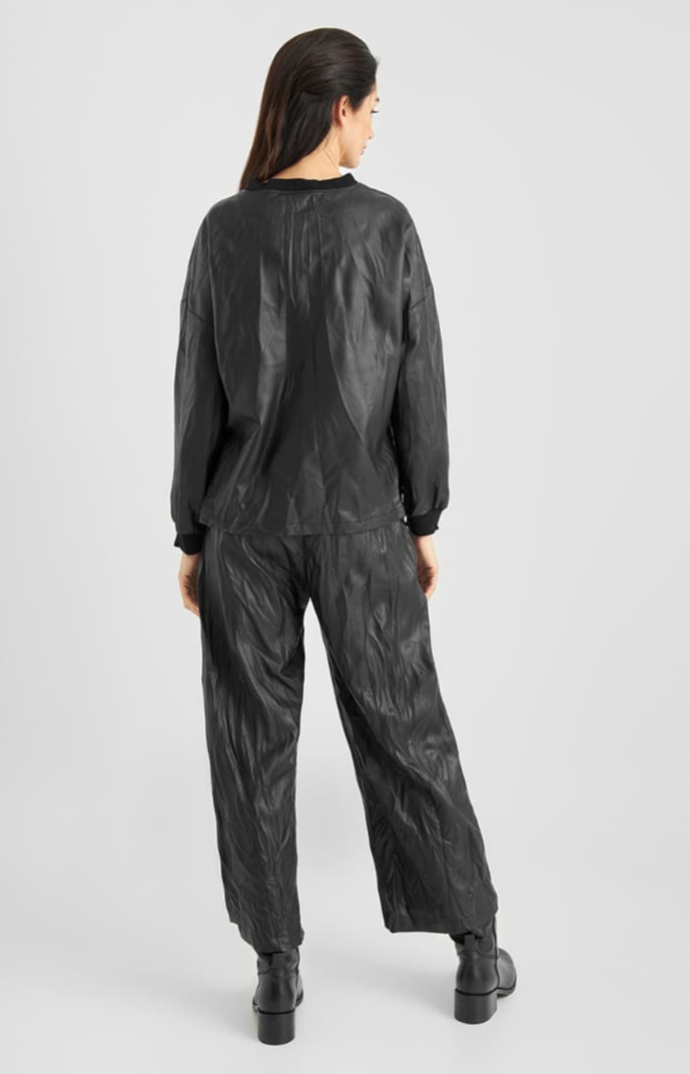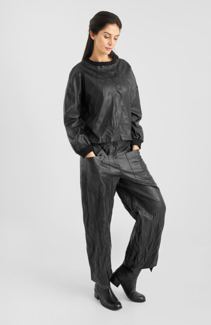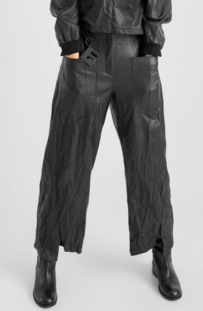Regular price €170.00 Save 0%Elsewhere Black Crinkle Vegan Leather Topstitched Barrel Leg Pant.