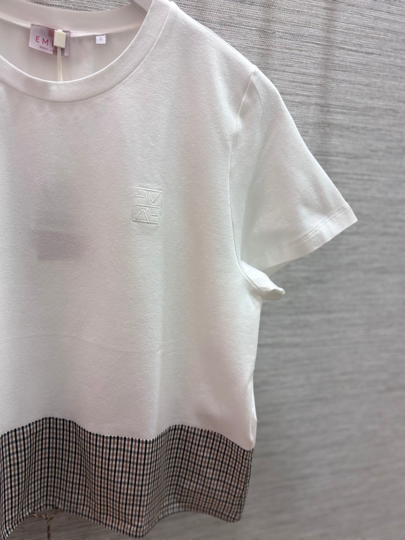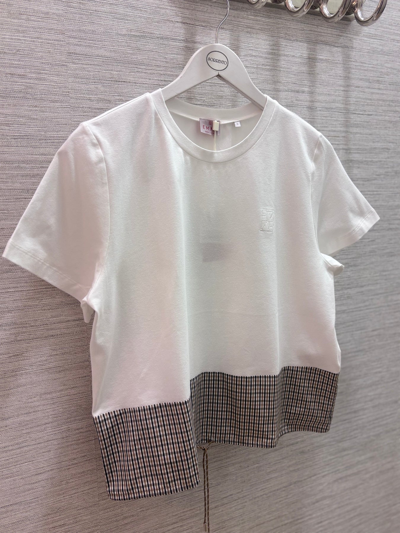 Regular price €95.00 Save 0%Emme Wool White Cotton Drawstring T-Shirt With Contrasting Plaid Check Hem.
