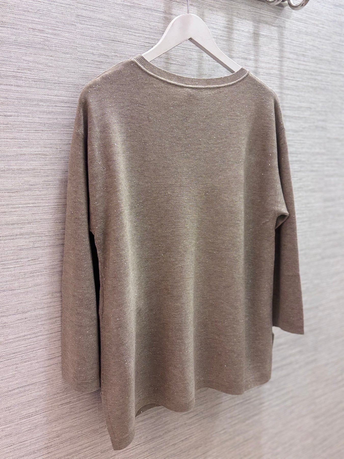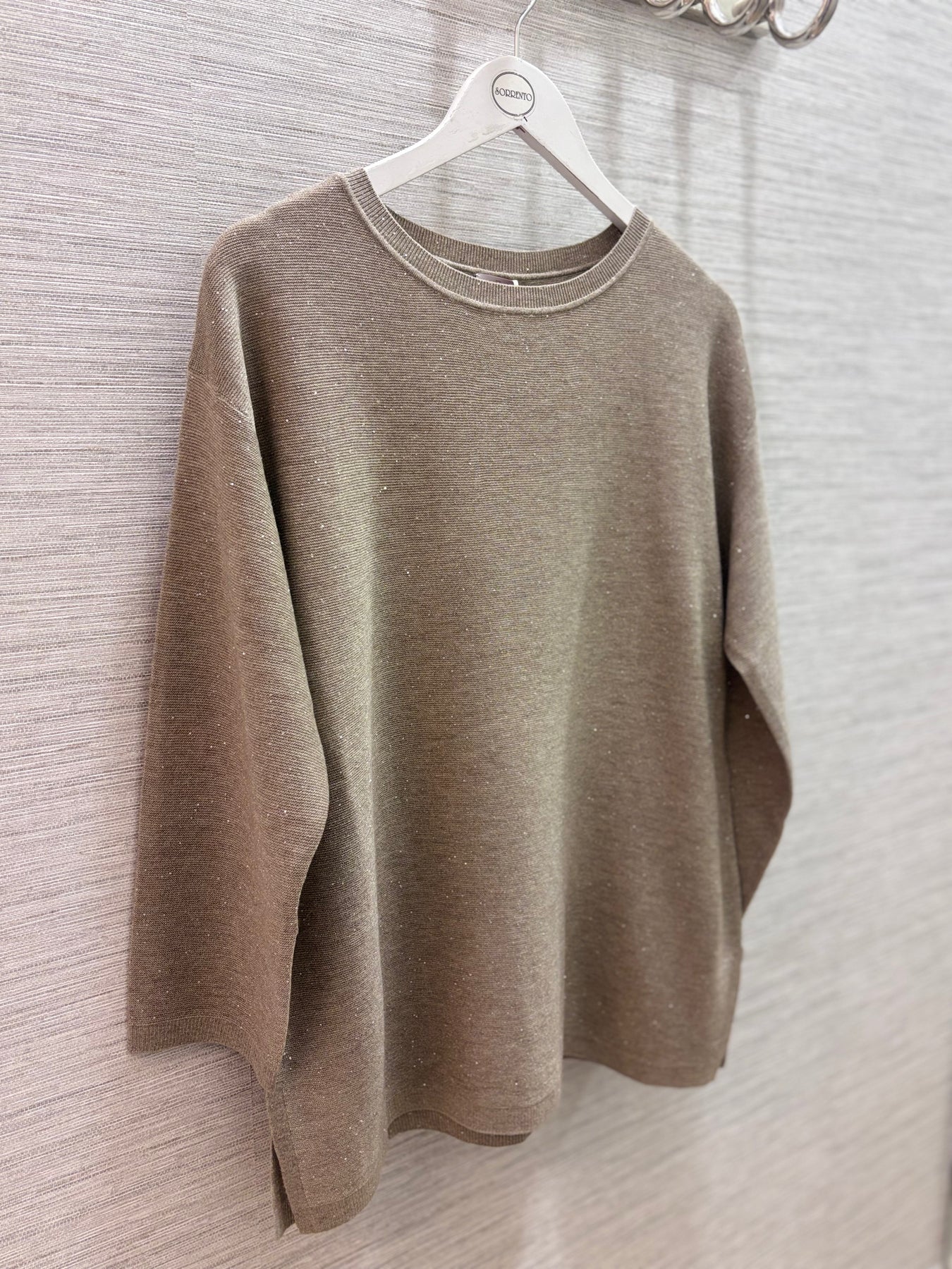 Regular price €150.00 Save 0%Emme Gold Lurex Long Sleeve Fine Knit Wool Blend Sweater With Side Slit.