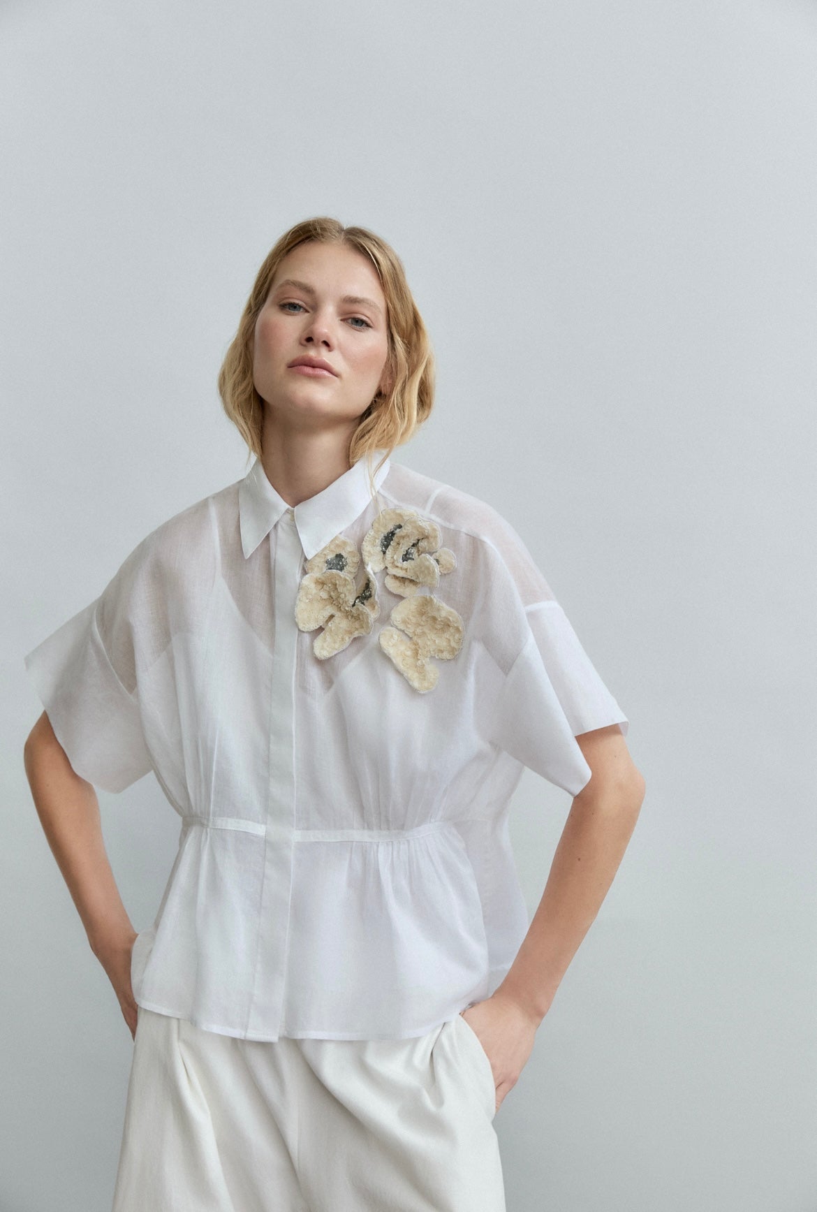Regular price €545.00 Save 0%Psophia White High Neck 3/4 Length Puff Skeeve Shirt With Hand Stitched Floral Detail.
