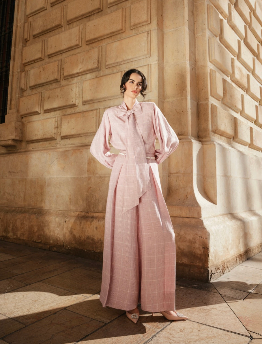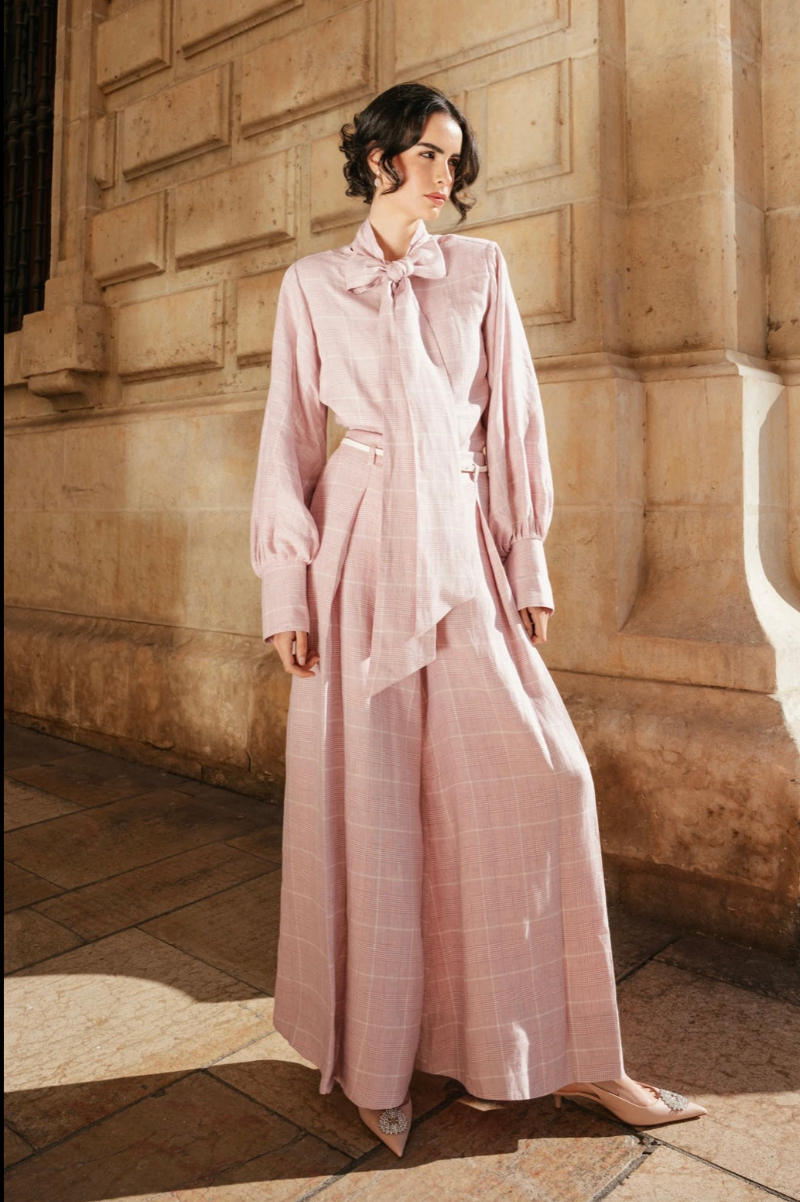 Regular price €415.00 Save 0%Linen Shirt Company Soft Pink/White Check Linen Wide Leg Pleated Palazzo High Waisted Pant.
