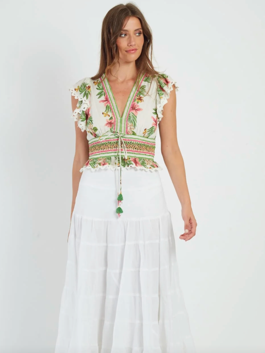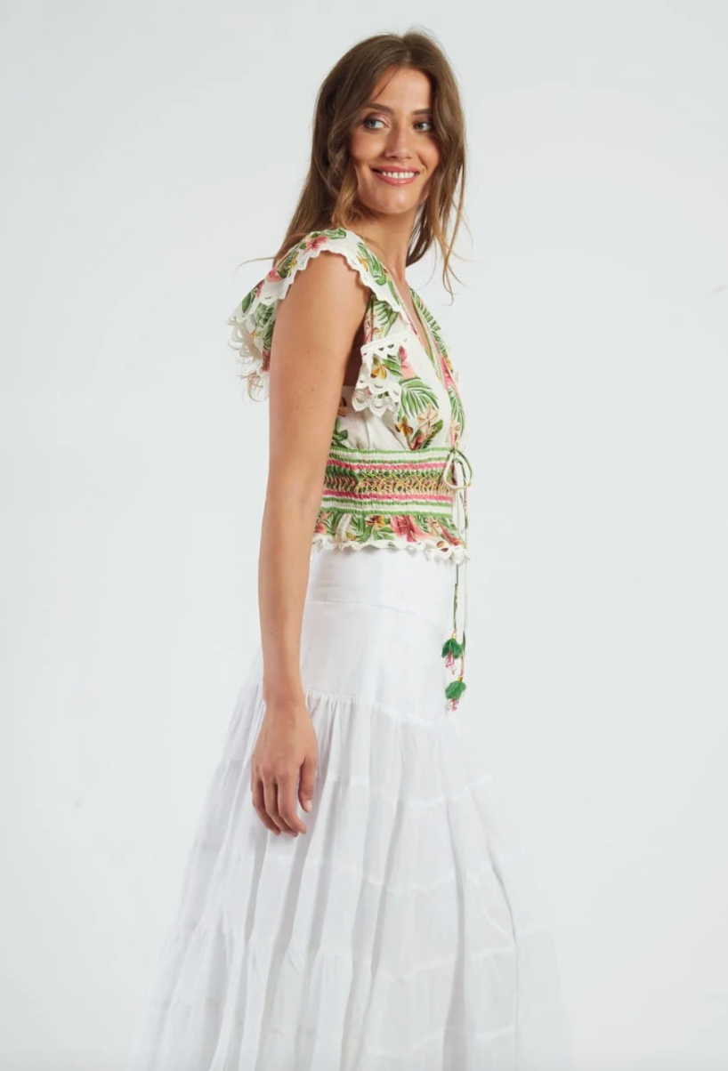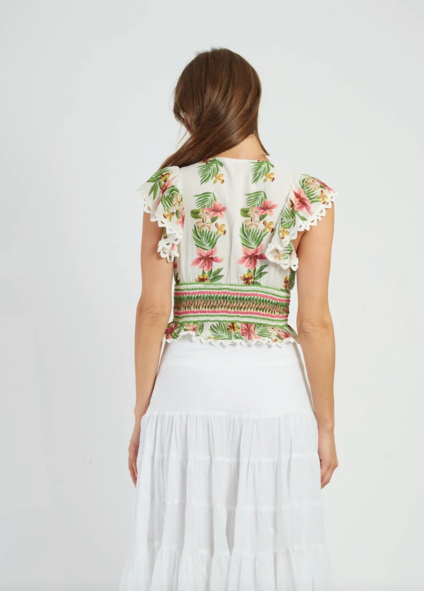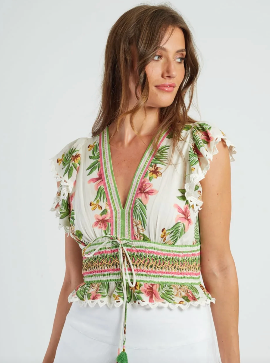 Regular price €105.00 Save 0%Derhy Floral Print Cotton V-Neck Cropped Top With Ruffled Sleeve/Waist.