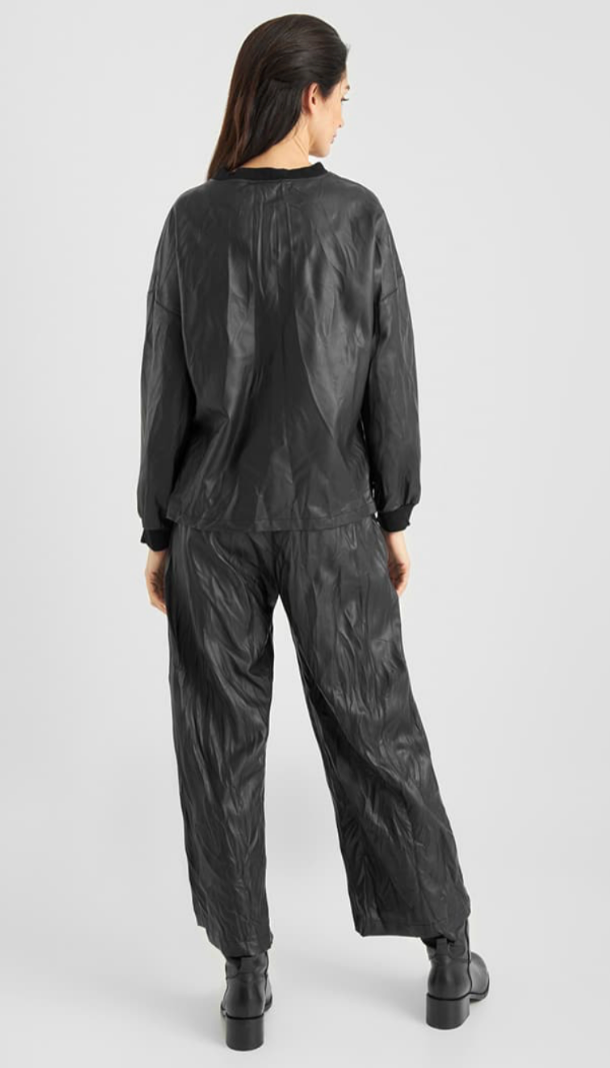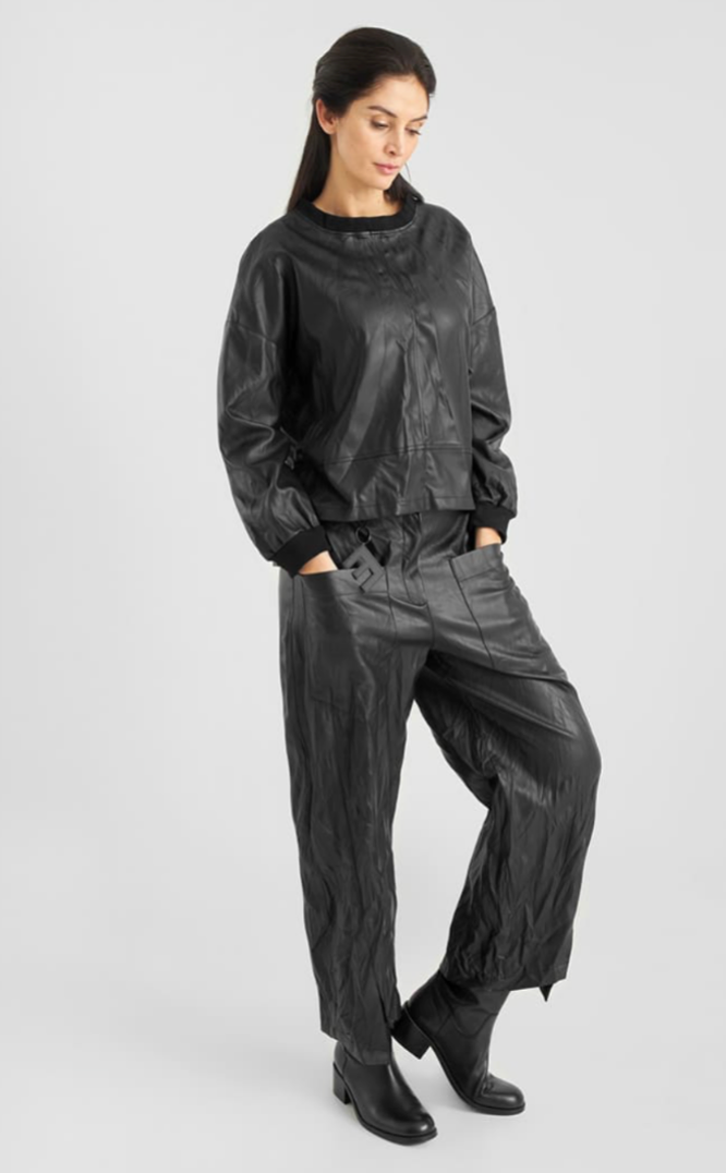Regular price €170.00 Save 0%Elsewhere Black Crinkle Vegan Leather Topstitched Barrel Leg Pant.