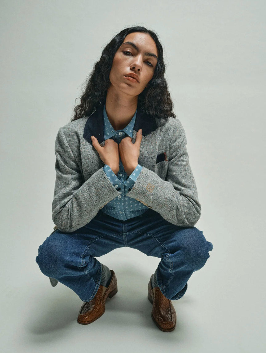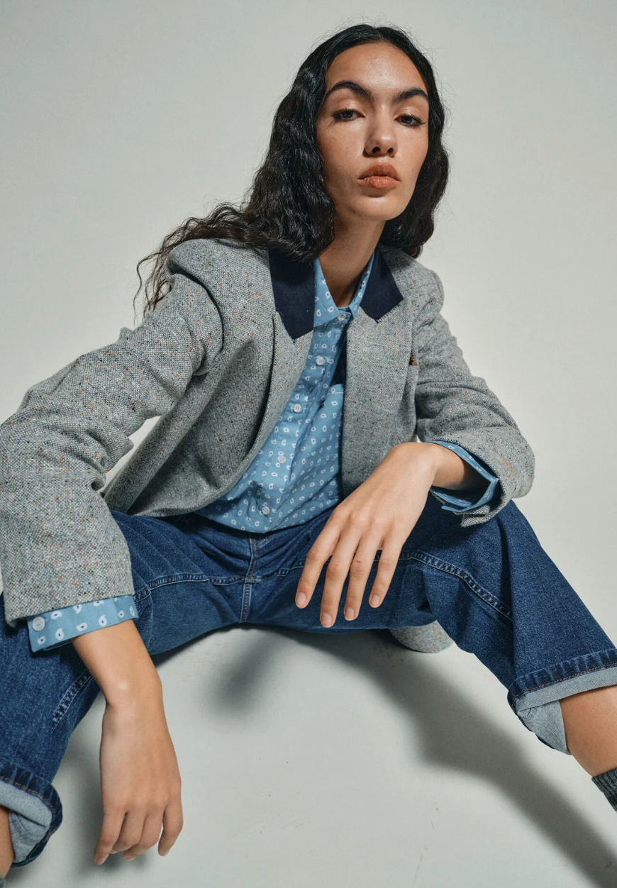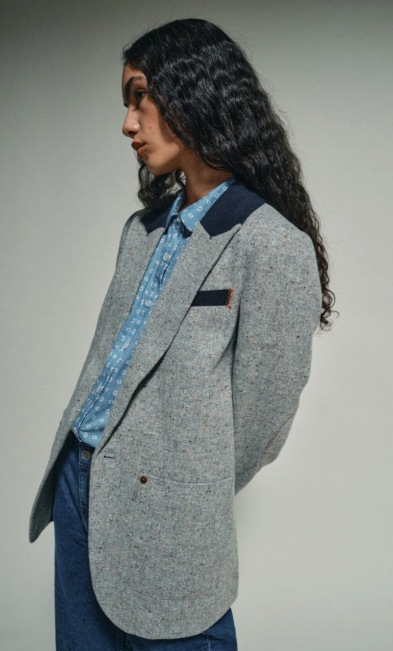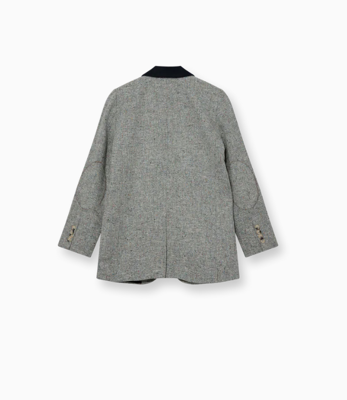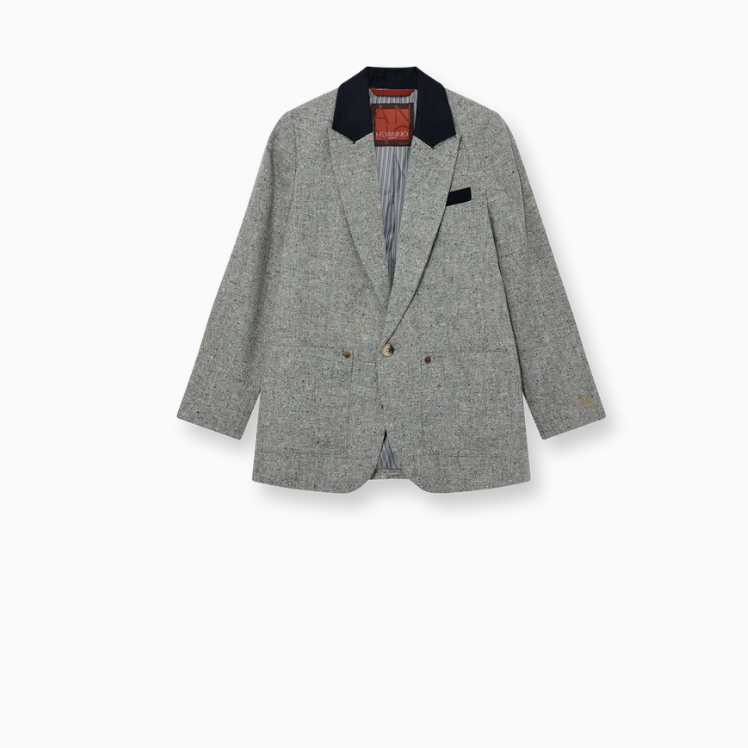 Regular price €329.00 Save 0%Heyanno Grey Wool/Silk Blend Tweed Double Breasted Blazer With Navy Trim Design.