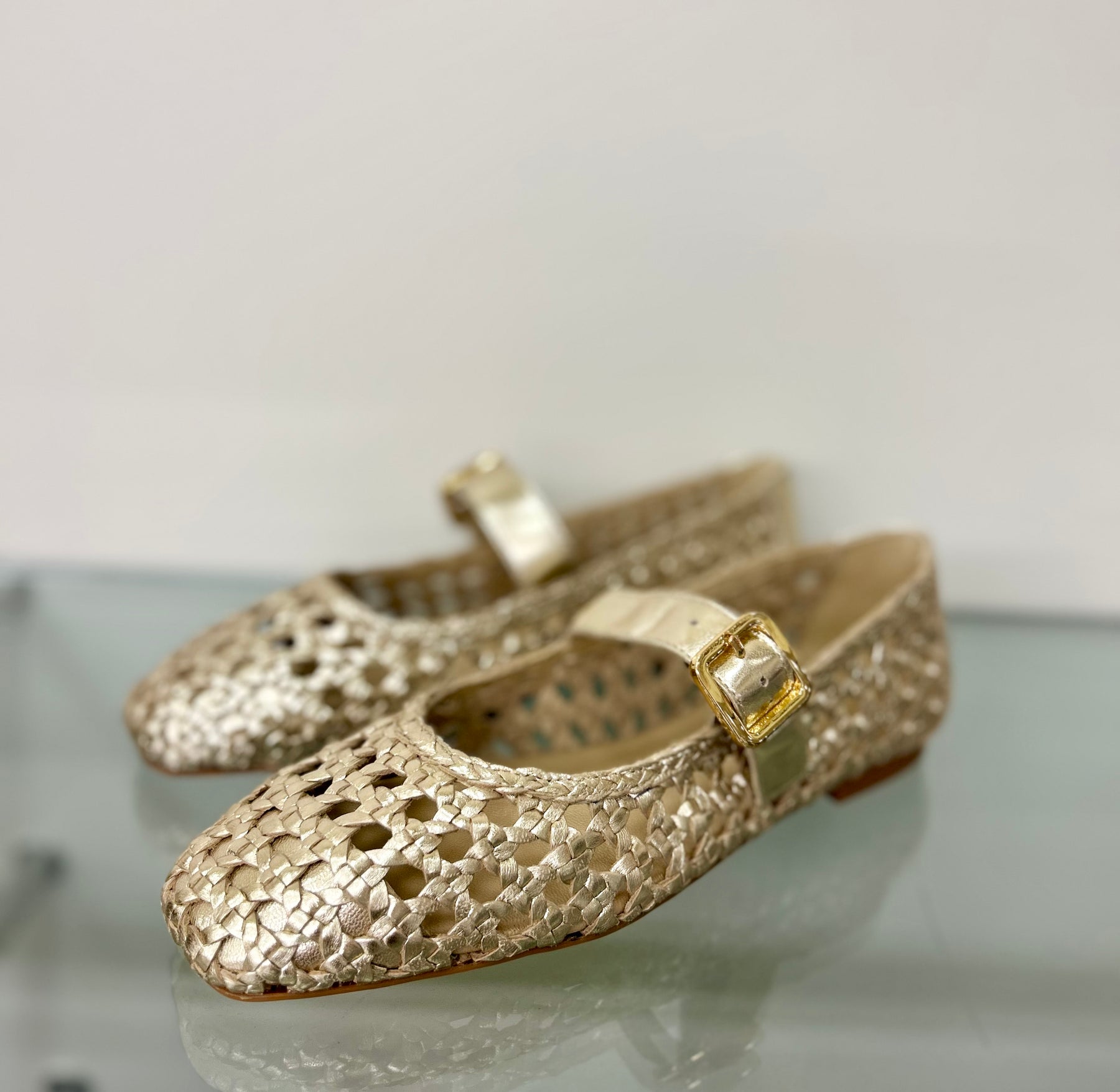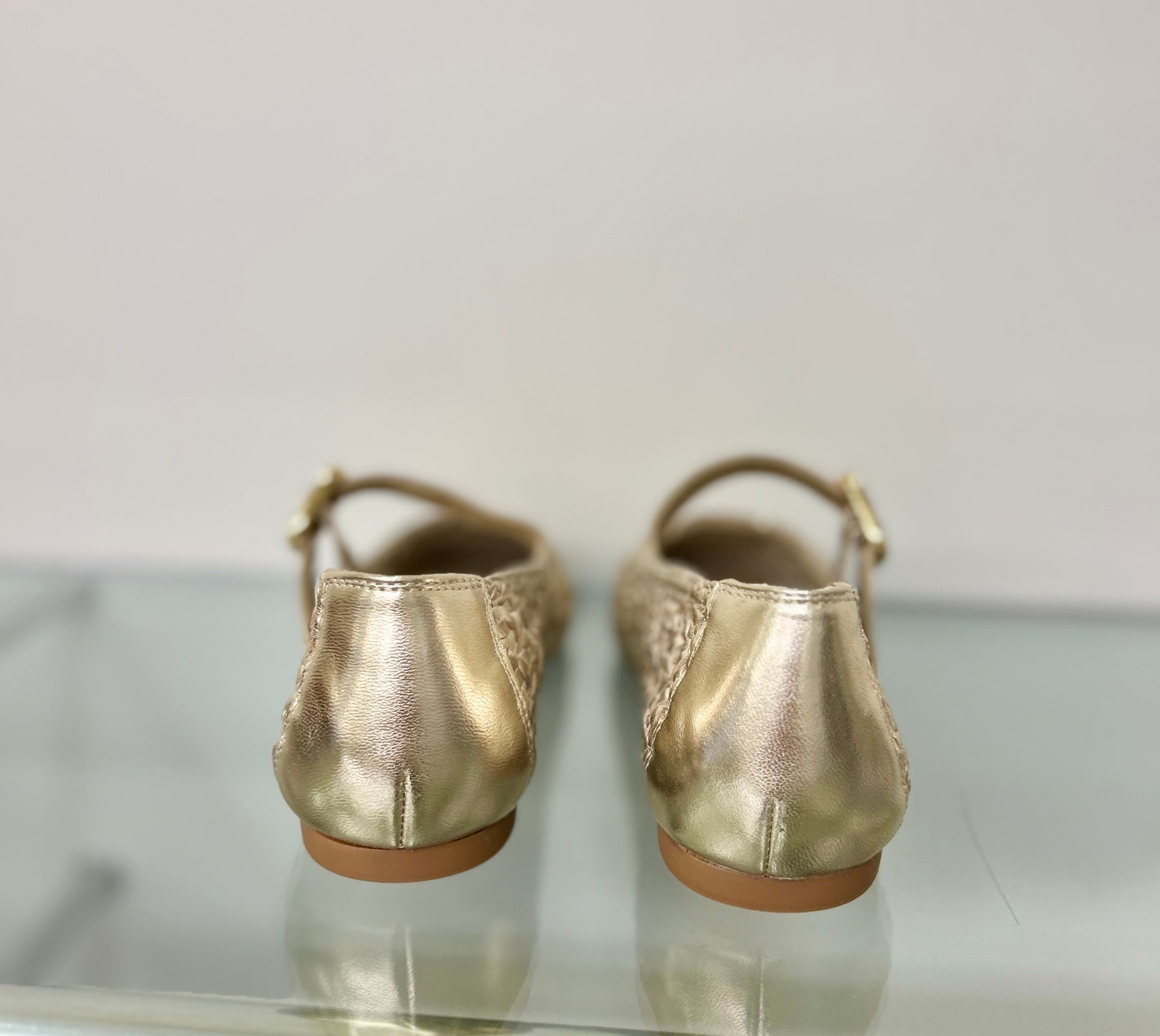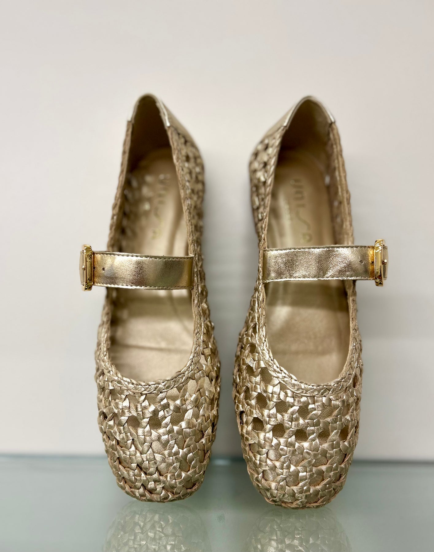 Regular price €150.00 Save 0%Unisa Gold Metallic Woven Square Toe Strap Pump.