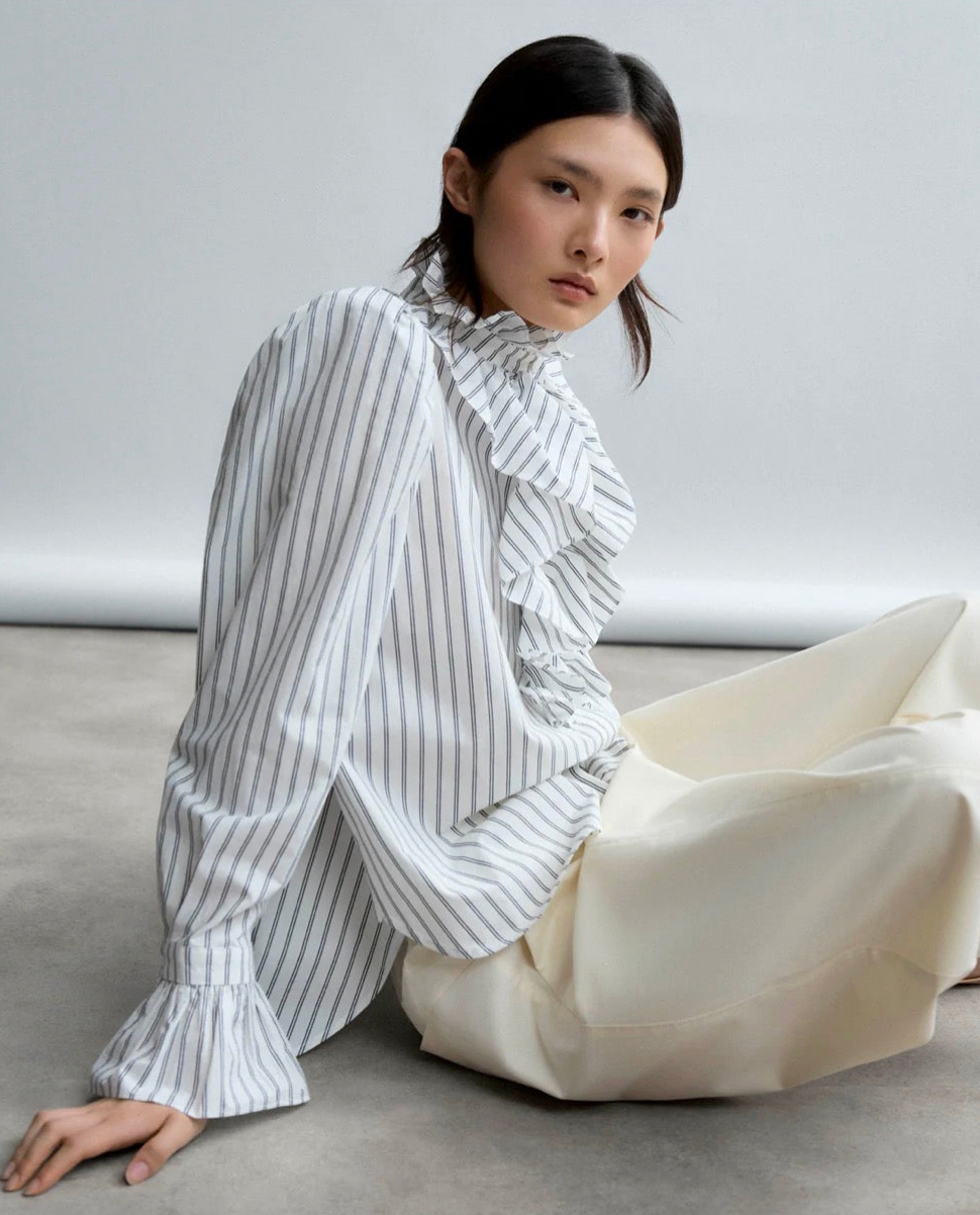 Regular price €215.00 Save 0%Psophia Striped Cotton Ruffle Shirt.