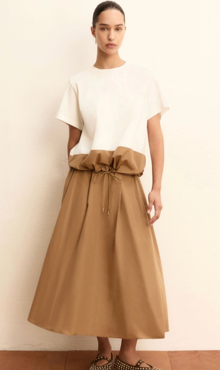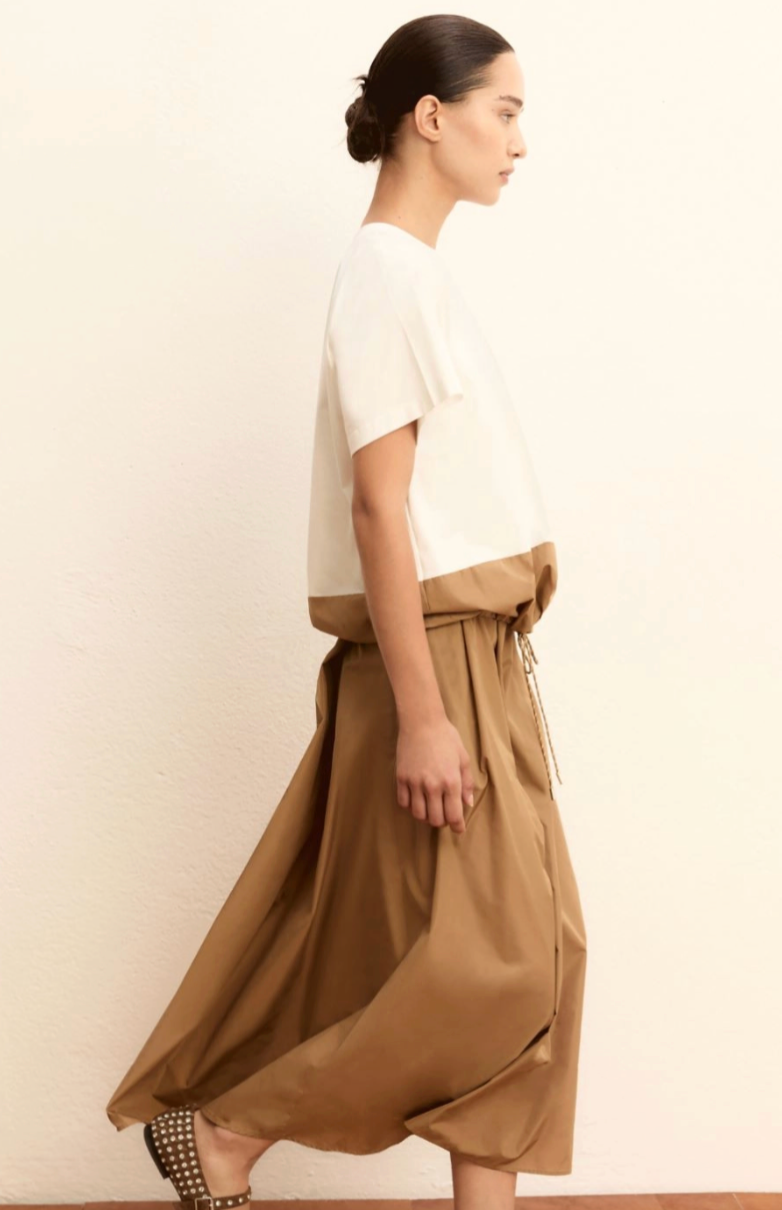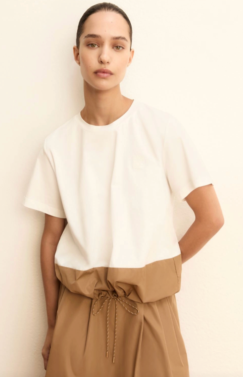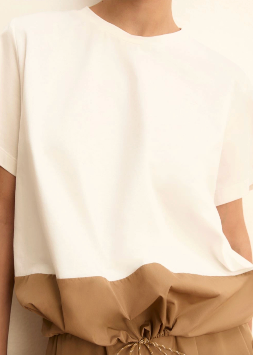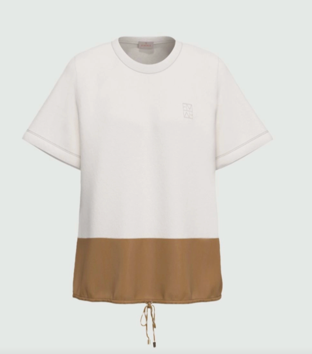 Regular price €95.00 Save 0%Emme White Cotton Drawstring Waist T-Shirt With Contrasting Camel Fabric.