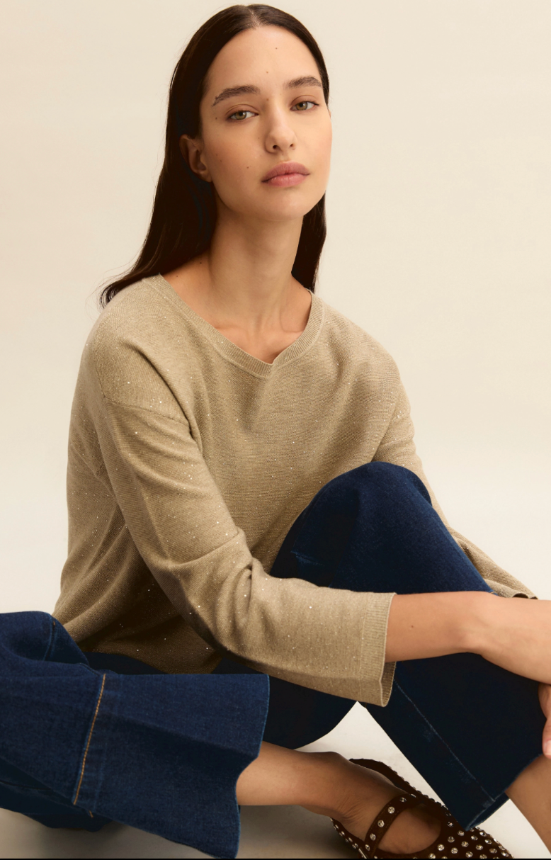 Regular price €165.00 Save 0%Emme Cream/Tan Stripe Linen Blend Knitted Sequin Short Sleeve Top.